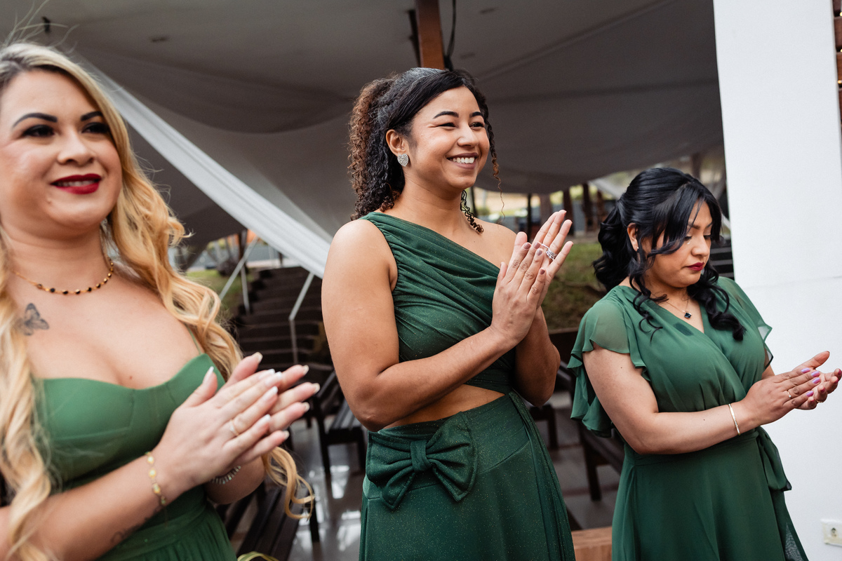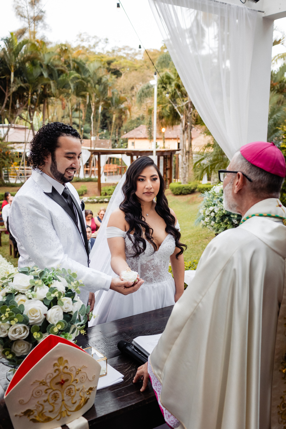 A natureza exuberante da região serviu como cenário perfeito para a cerimônia ao ar livre, realizada no final da tarde sob a benção do Padre Marcelo. A atmosfera romântica foi intensificada pela música ao vivo de Bossa Nova, que embalou os noivos e seus convidados desde a entrada da noiva até o último brinde da festa.